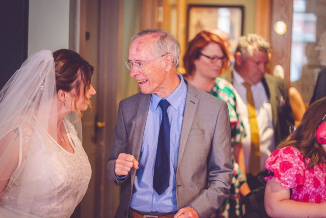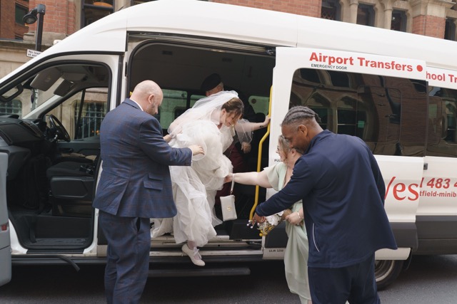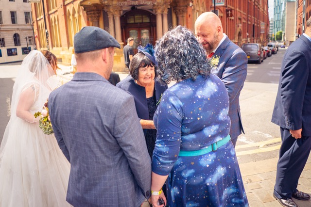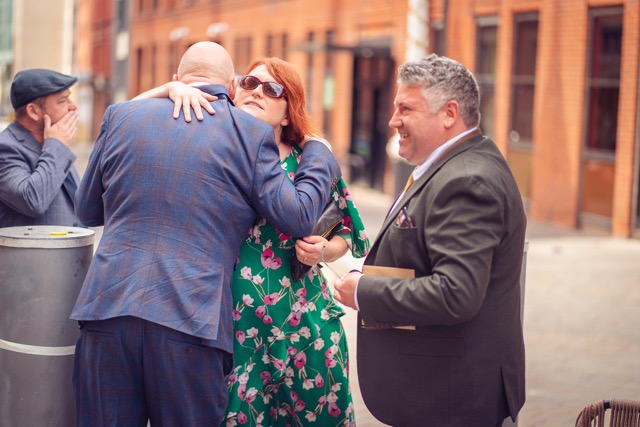 It was such a change of pace from the earlier part of the day. But the August Manchester weather held up meaning we had sunshine while waiting outside for the venue to let everyone in. Lots of hugs as the extra reception guests arrived!